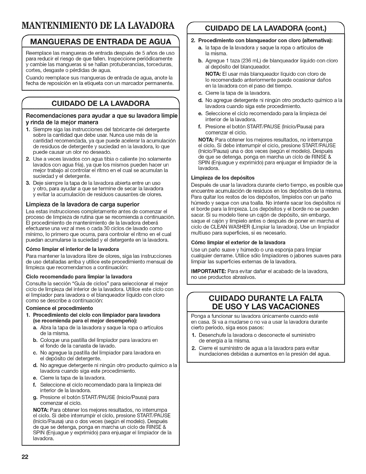 MANTENIMIENTO DE LA LAVADORA ........................... 22