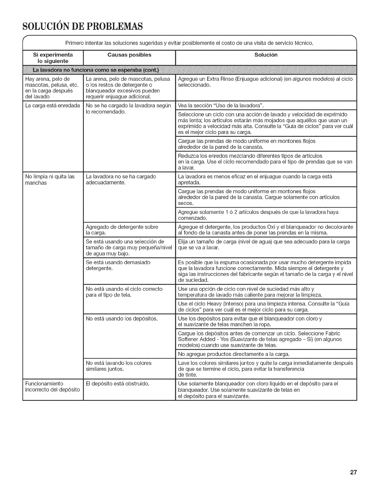 Funcionamiento El dep6sito esta obstruido. Use solamente blanqueador con cloro liquido en el dep6sito para el
