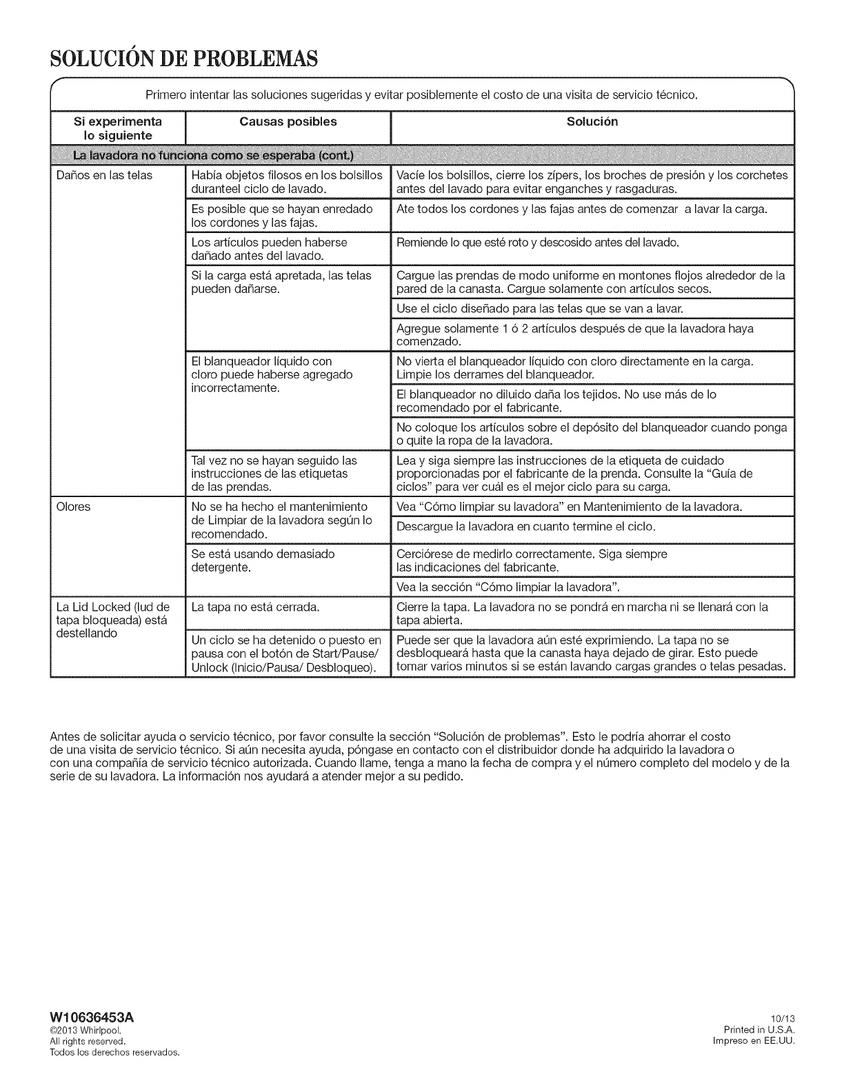Antes de solicitar ayuda o servicio tecnico, per favor consulte la secci6n "Soluci6n de problemas". Esto le podria ahorrar el costo