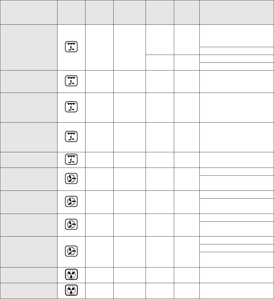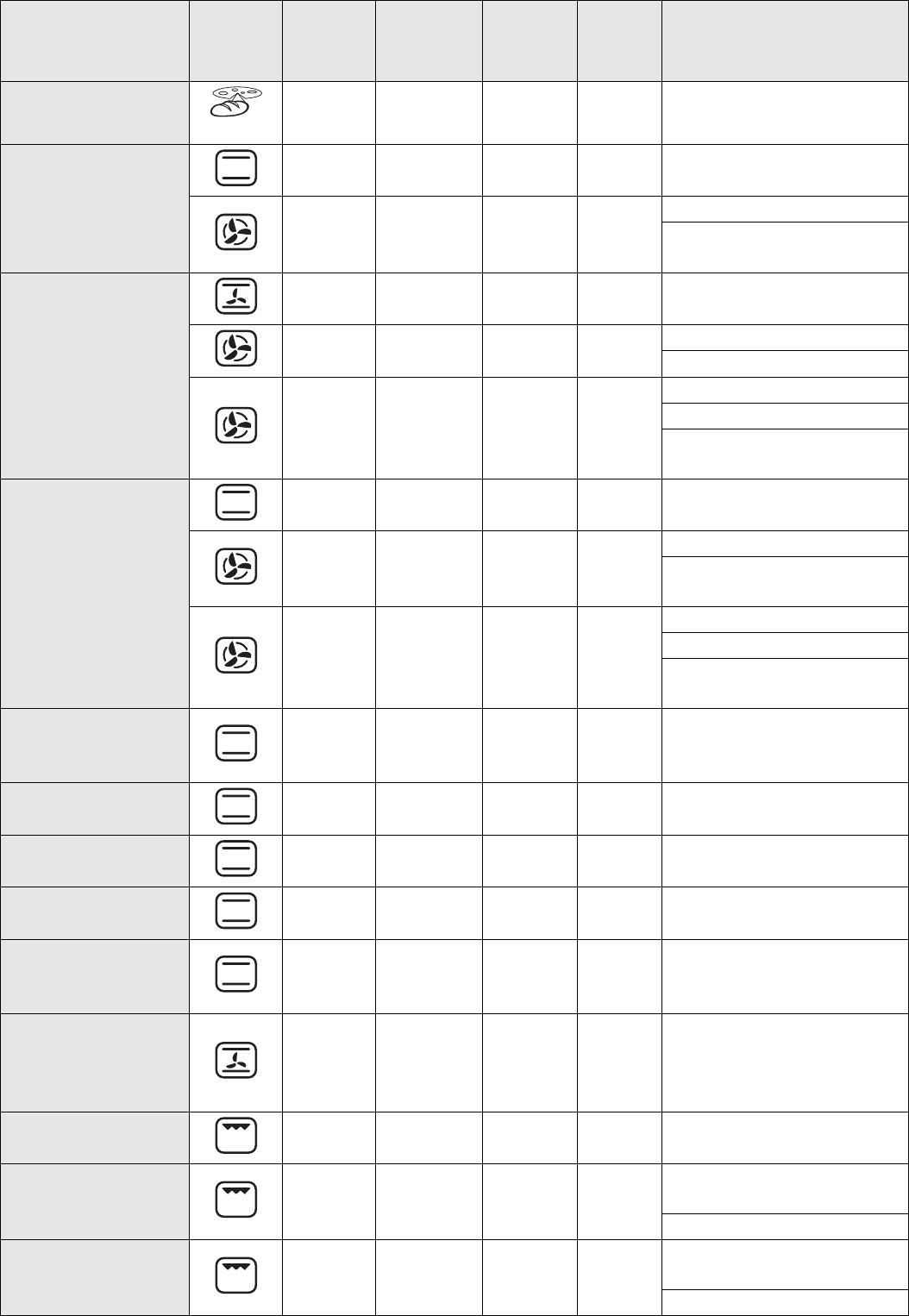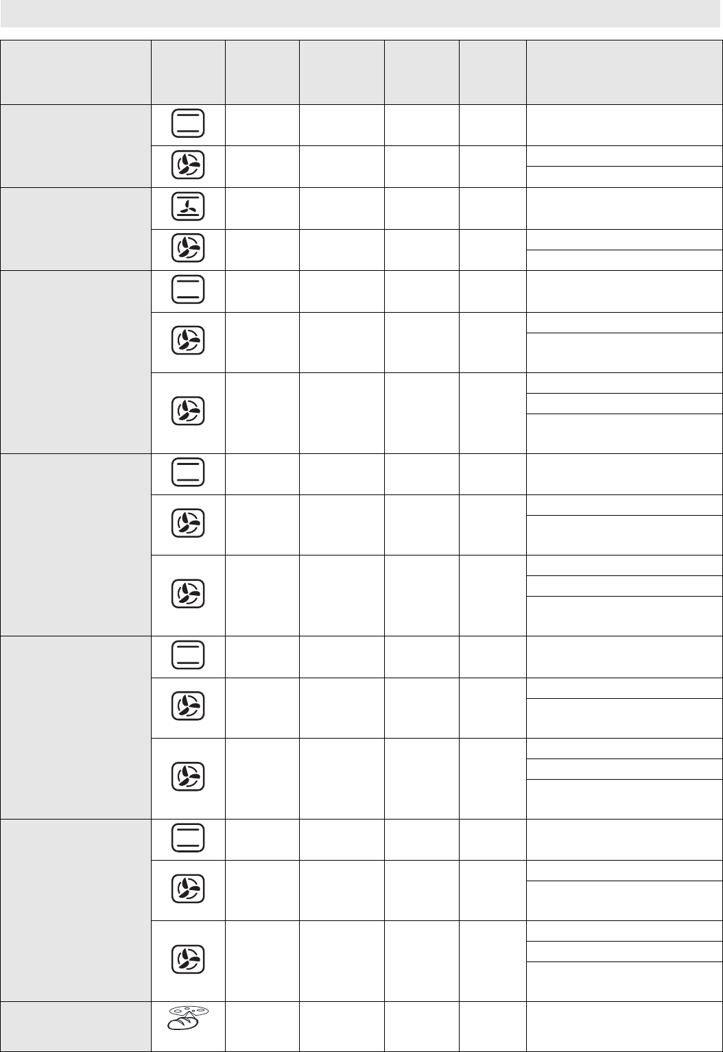 The table indicates the best function to use for any given food, to be cooked on one or more shelves at the