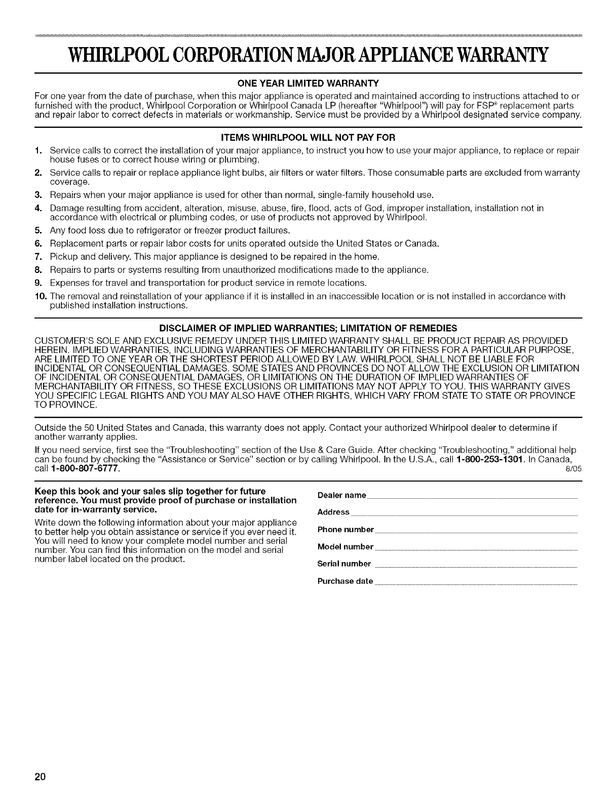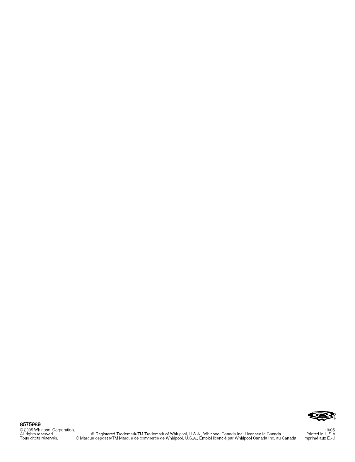 All rights reserved, ® Registered Trademark/TM Trademark of Whirlpool, U.S.A., Whirlpool Canada Inc. Licensee in Canada