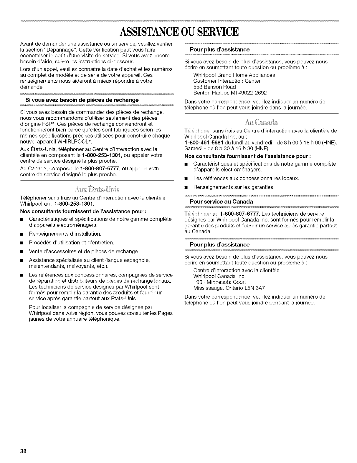 ".D_pannage", de I'aide supplementaire peut _tre trouvee en verifiant la section "Assistance ou service" ou en appelant Whirlpool. Aux