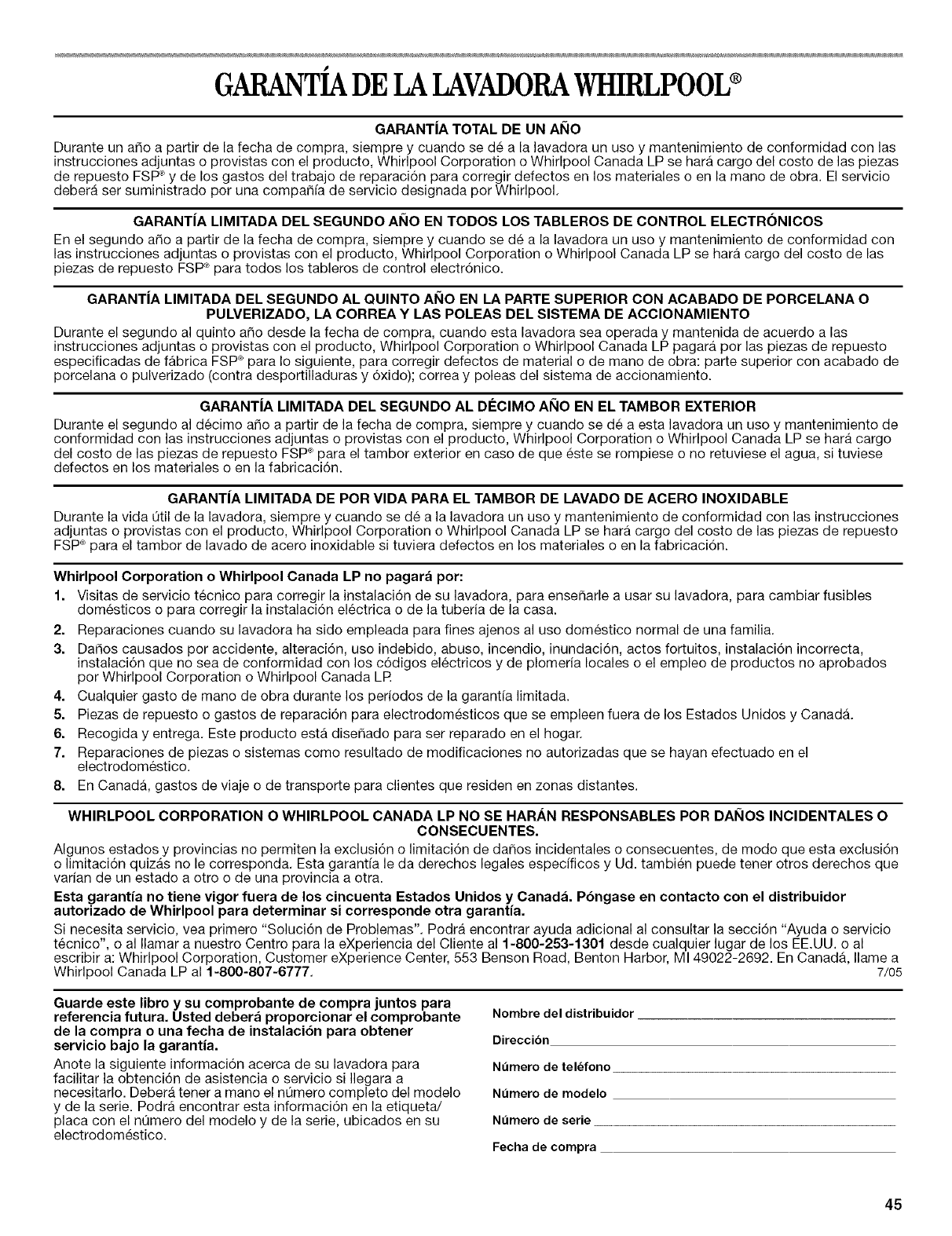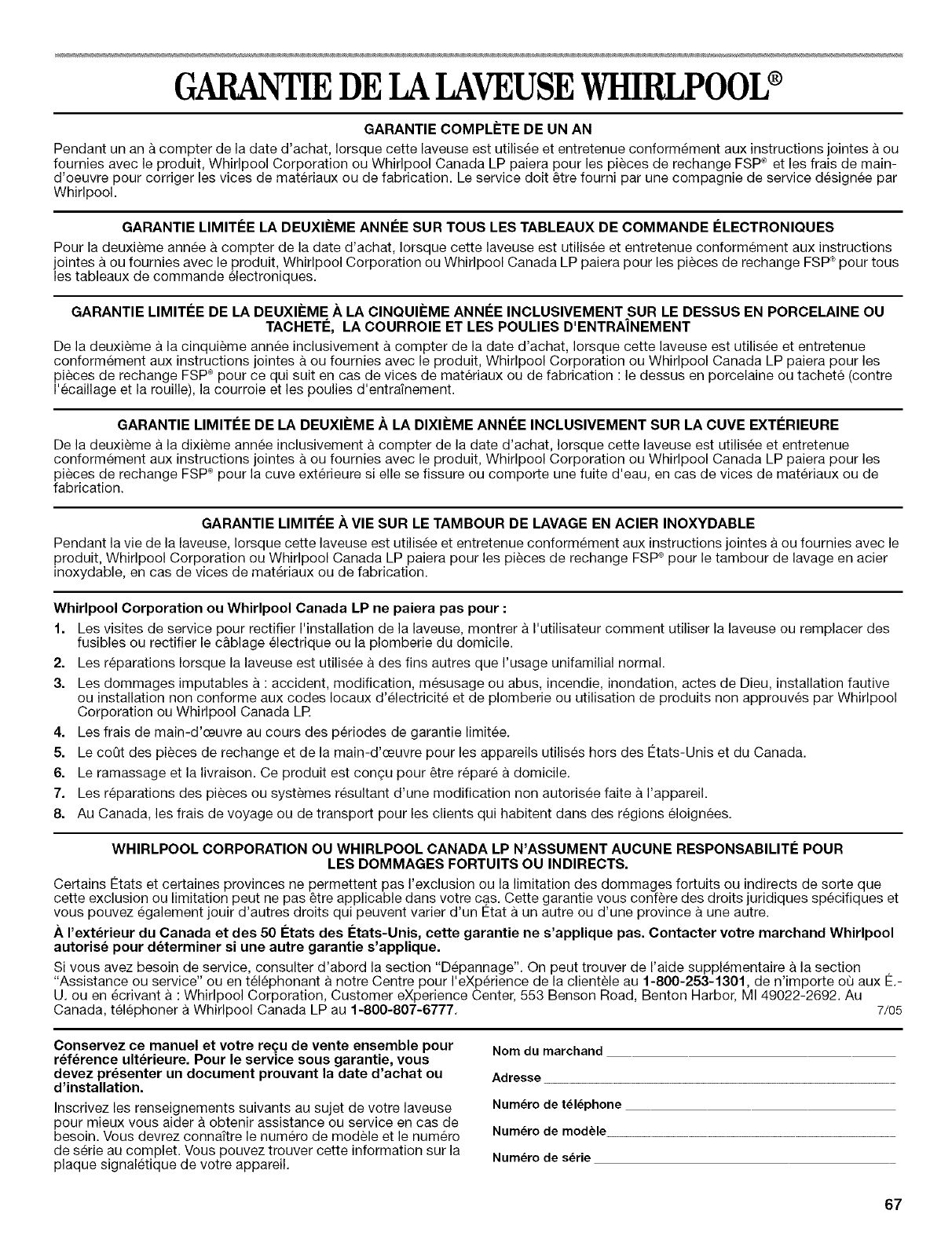 Canada, telephoner a Whirlpool Canada LP au 1-800-807-6777. 7/05