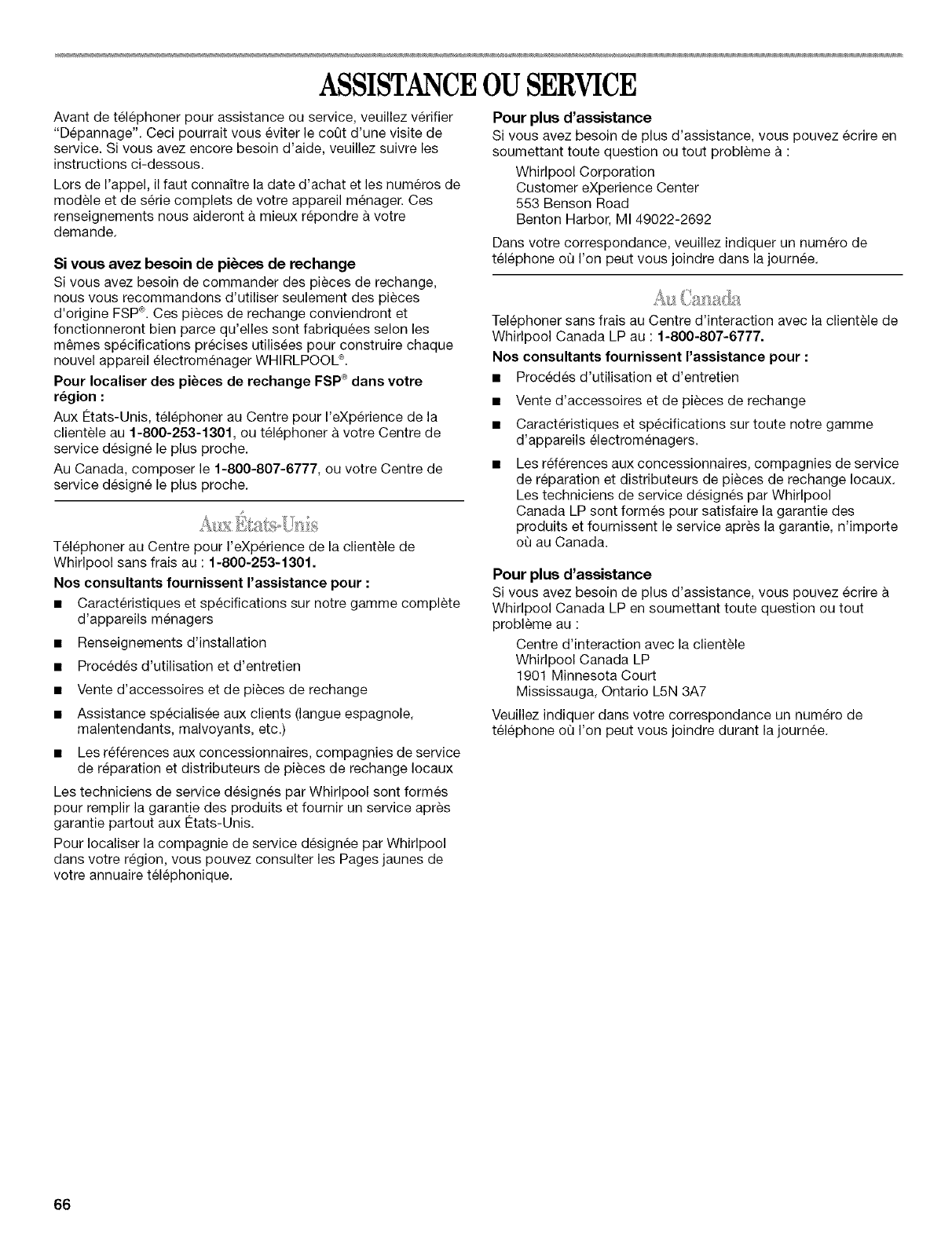 "Assistance ou service" ou en telephonant a notre Centre pour I'eXperience de la clientele au 1-800-253-1301, de n'importe ou aux 12.-
