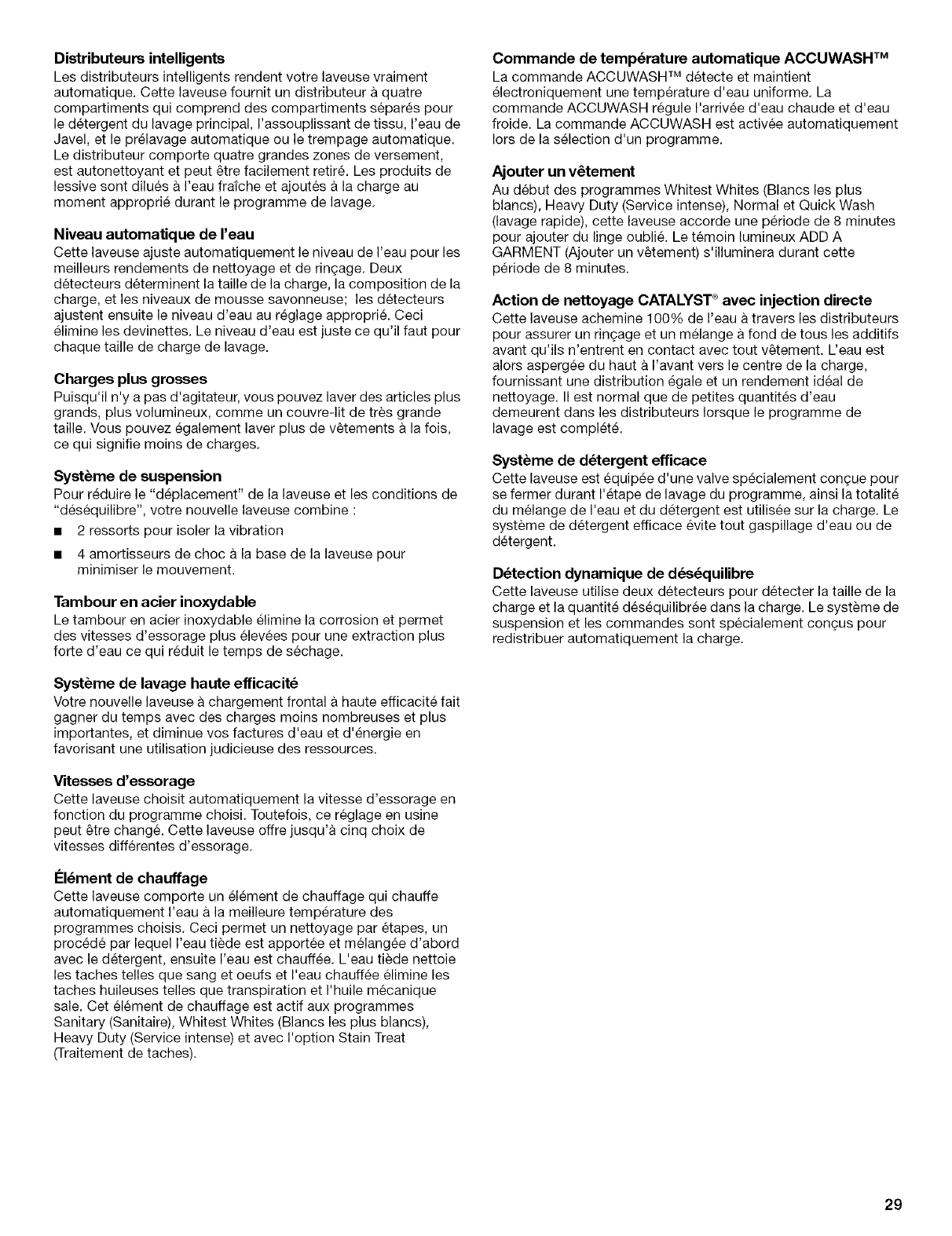 Pendant la vie de la laveuse, Iorsque cette laveuse est utilisee et entretenue conformement aux instructions fournies avec le produit,