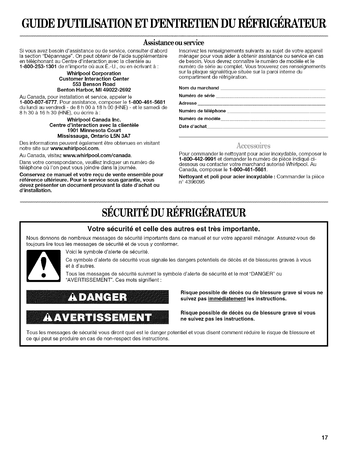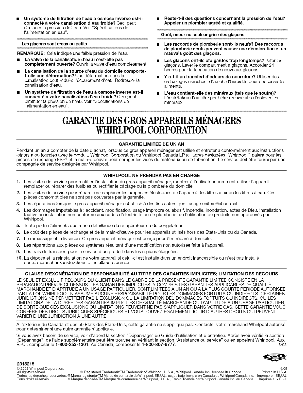 Tous droits r_serv_s. ® Marque depos_eFi-M Marque de commerce de Whirlpool, U.S.A., Emploi licenci_ par Whirlpool Canada Inc. au Canada Imprime aux E.-U.