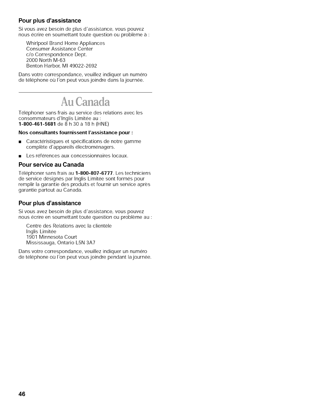 n'importe ou aux E.-U. ou en ecrivant a : Whirlpool Corporation,