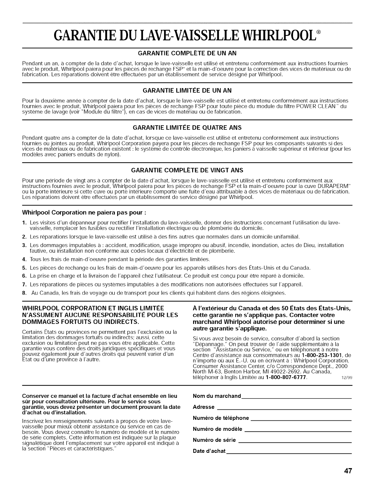 par Whirlpool sont formes pour remplir la garantie des