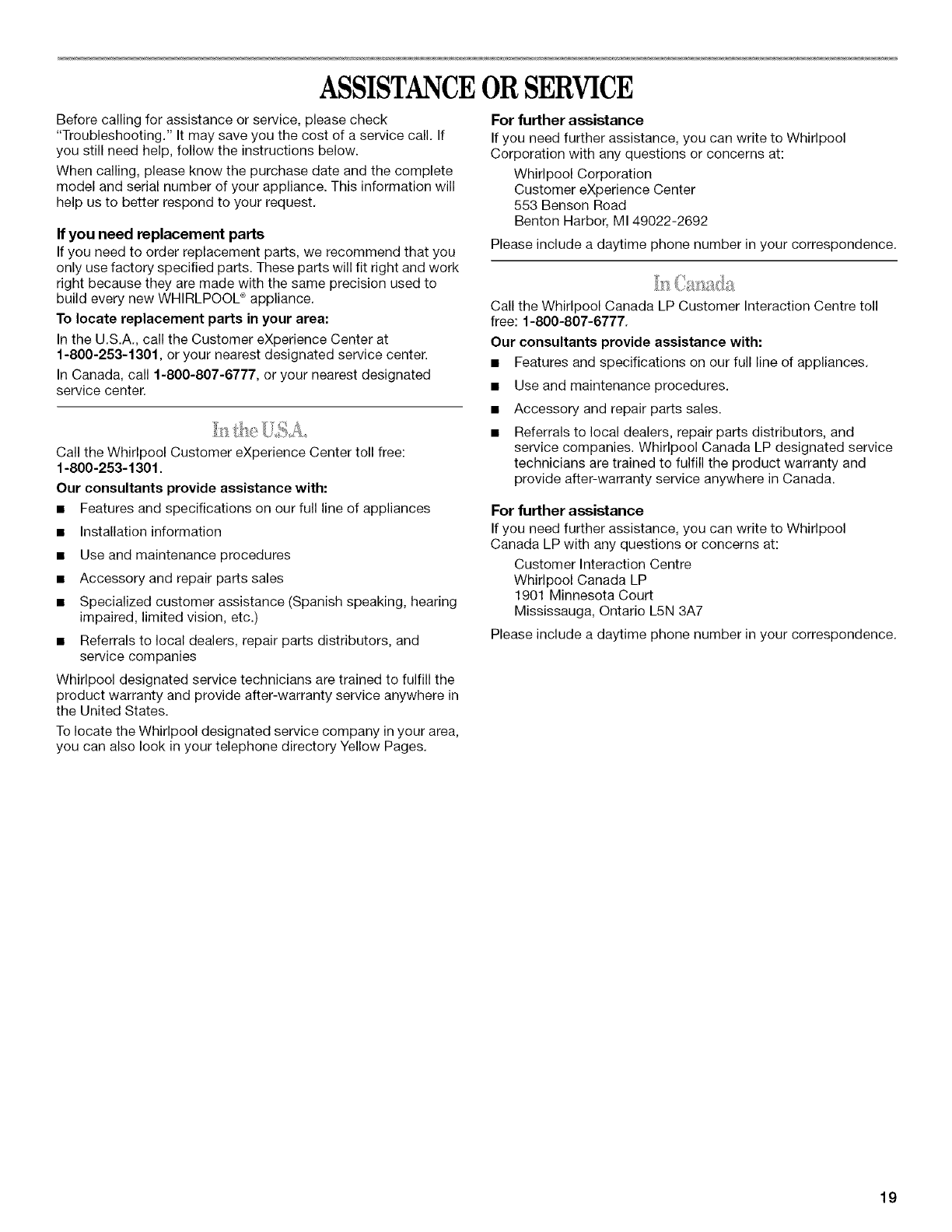 parts, accessories or service, call: 1-800-253-1301.