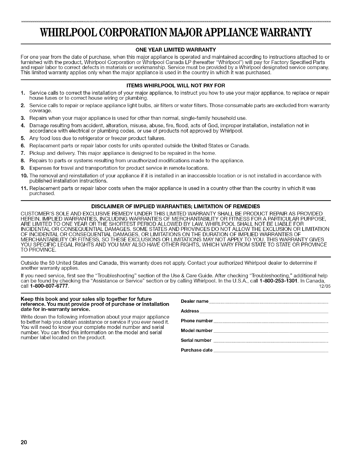 /_,I'exterieur du Canada et des 50 €tats des 12tats-Unis, cette garantie ne s'applique pas. Contacter votre marchand Whirlpool autorise