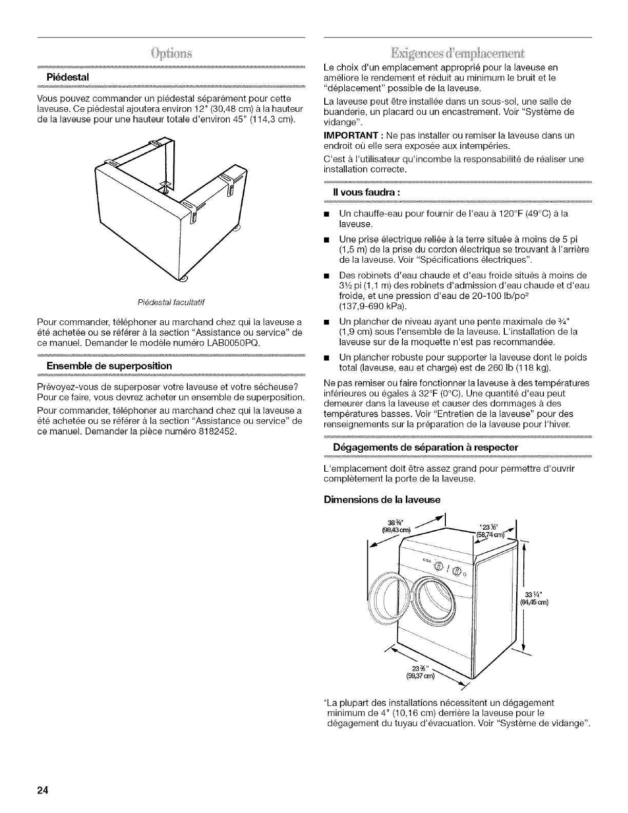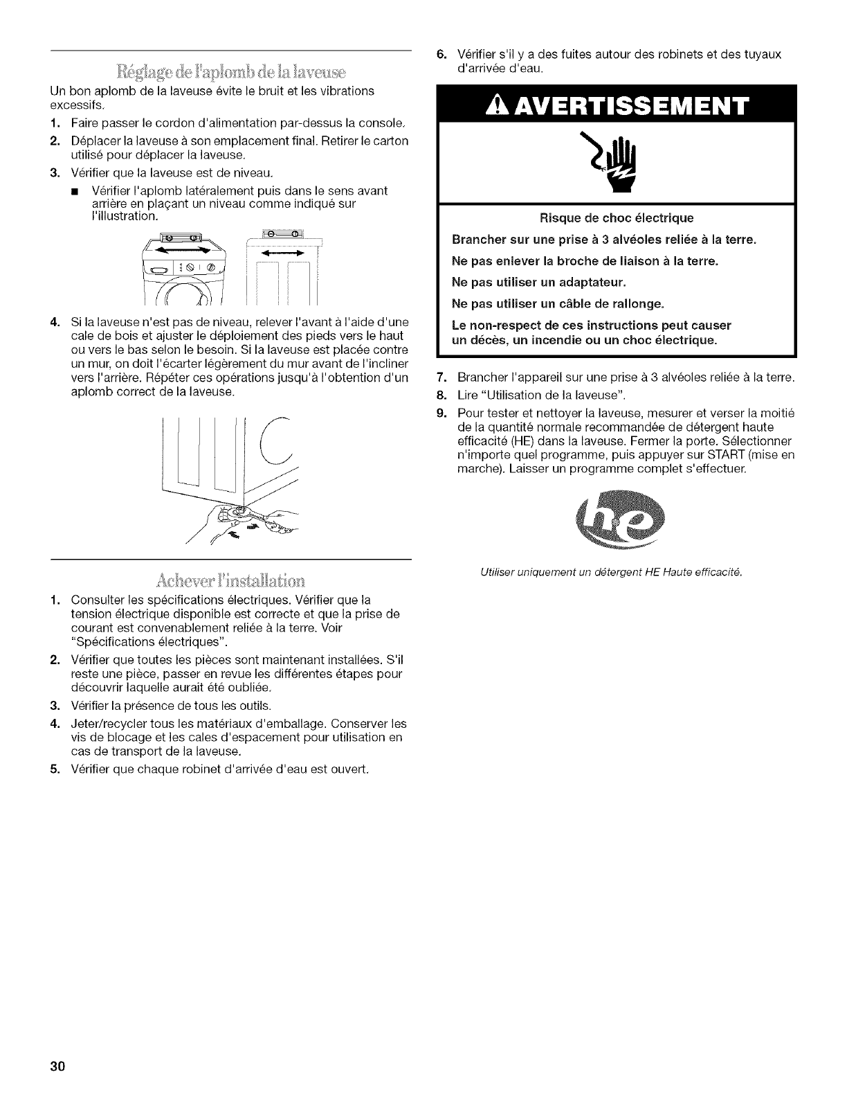 Reglage de I'aplomb de la laveuse ............................................ 30