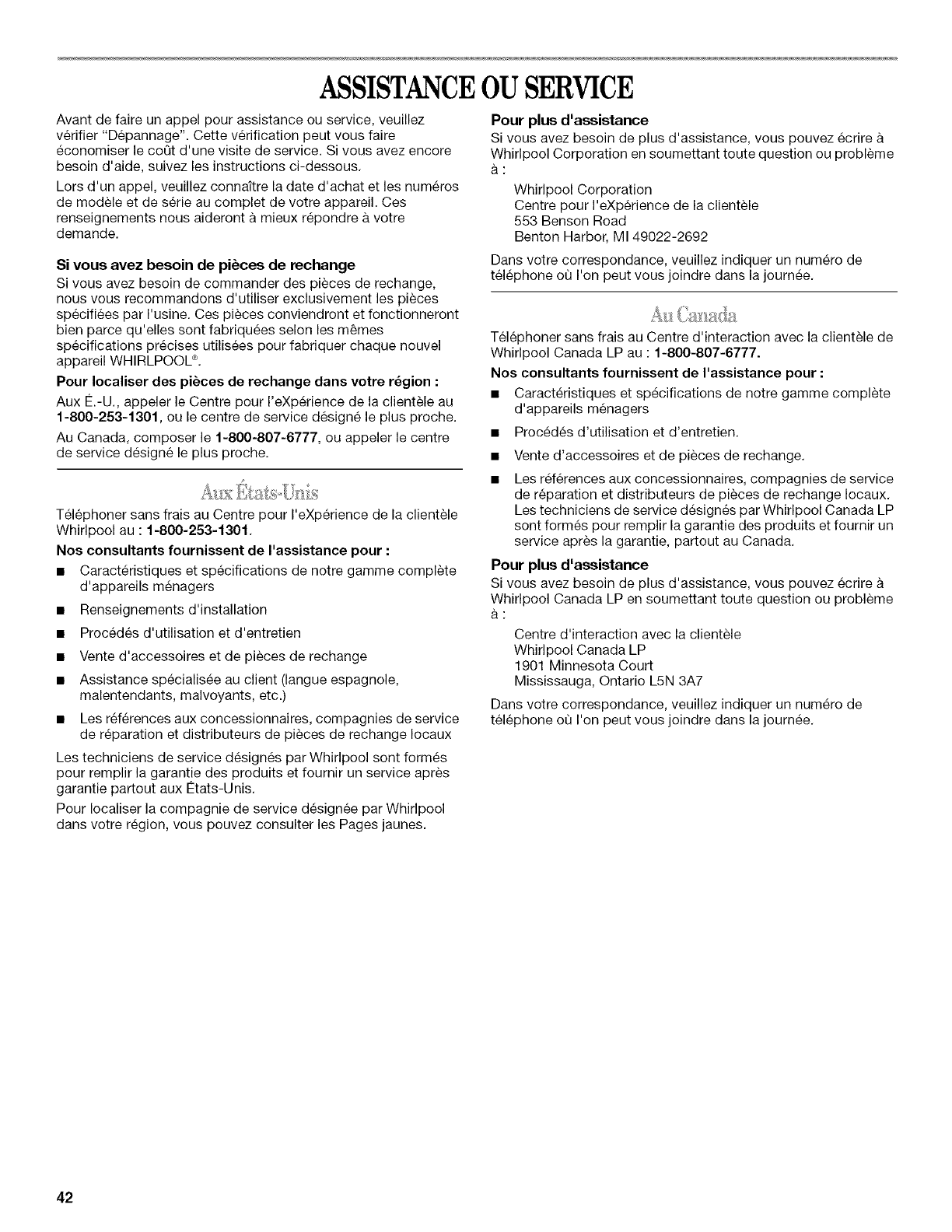 ".Depannage", de I'aide supplementaire peut _tre trouvee en verifiant la section "Assistance ou service" ou en appelant Whirlpool. Aux