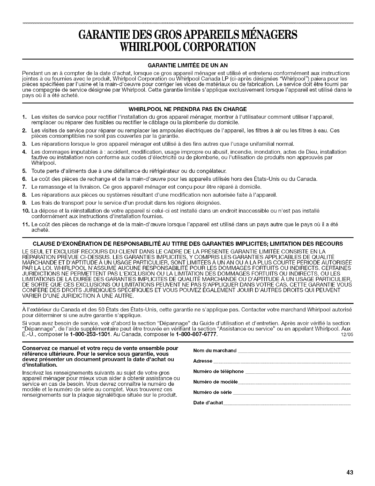 PAR LA LOI. WHIRLPOOL N'ASSUME AUCUNE RESPONSABILITE POUR LES DOMMAGES FORTUITS OU INDIRECTS. CERTAINES