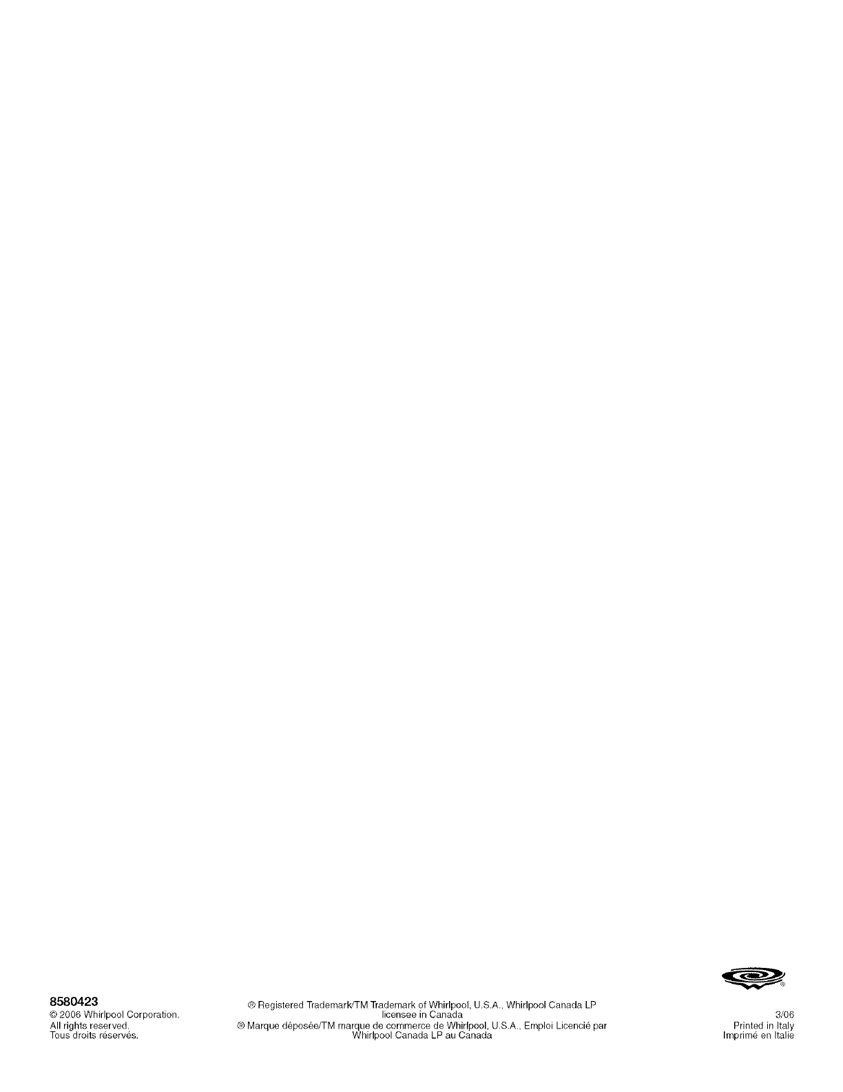 ® Registered Trademark/TM Trademark of Whirlpool, U,S,A,, Whirlpool Canada LP