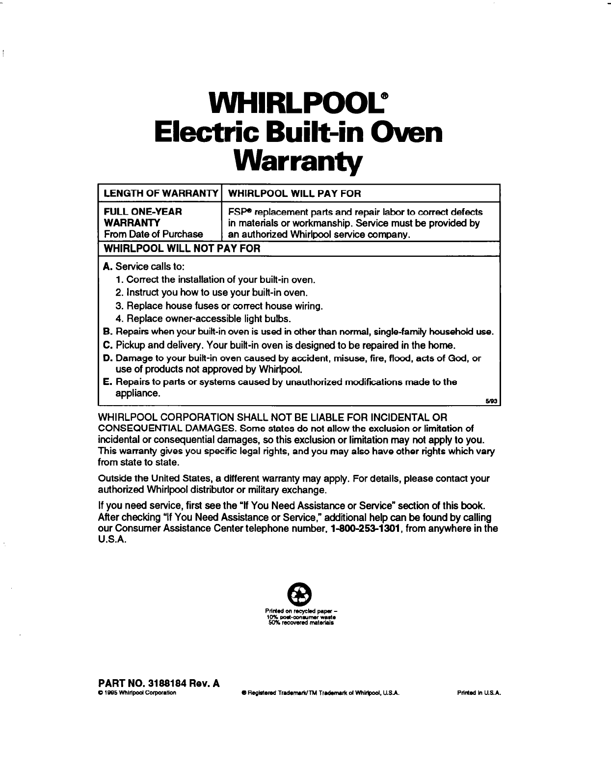 WHIRLPOOL CORPORATION SHALL NOT BE LIABLE FOR INCIDENTAL OR
