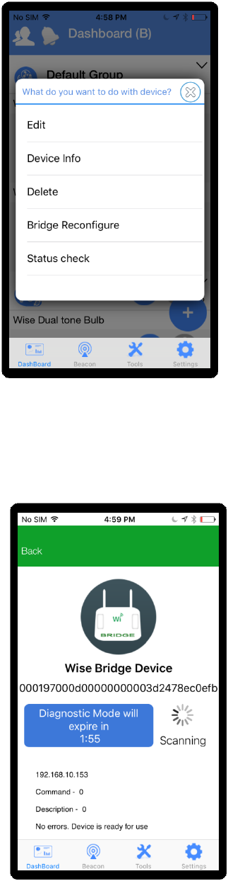 b) Bridge enters diagnostic mode and details of the bridge can be seen here.