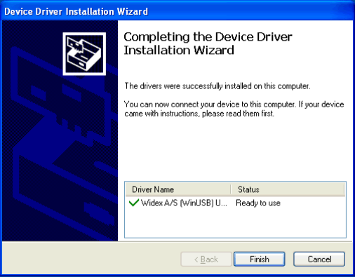 3. Select Finish, and the Widex USB Link is ready to be used.