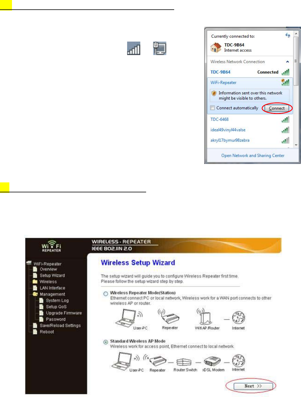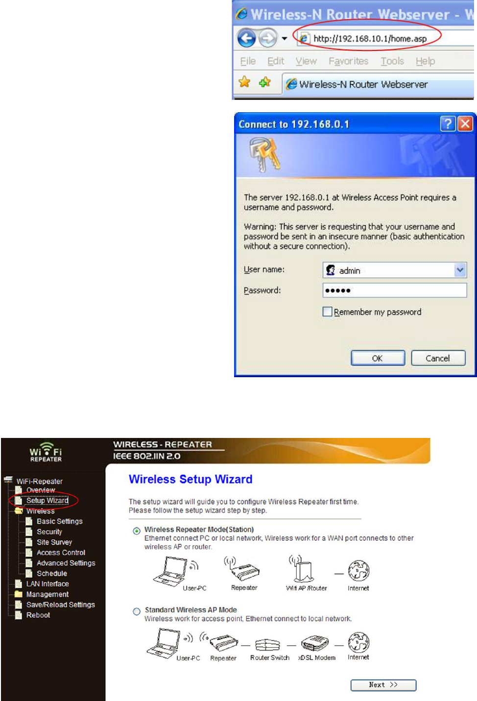 below: Select “Wireless Repeater Mode (Station)” and click on