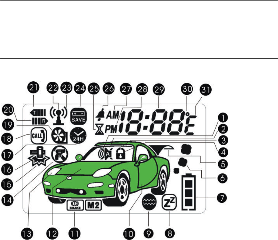 1. Audio alert mode 13. Parking light indication 23. Remote control’s transmitting