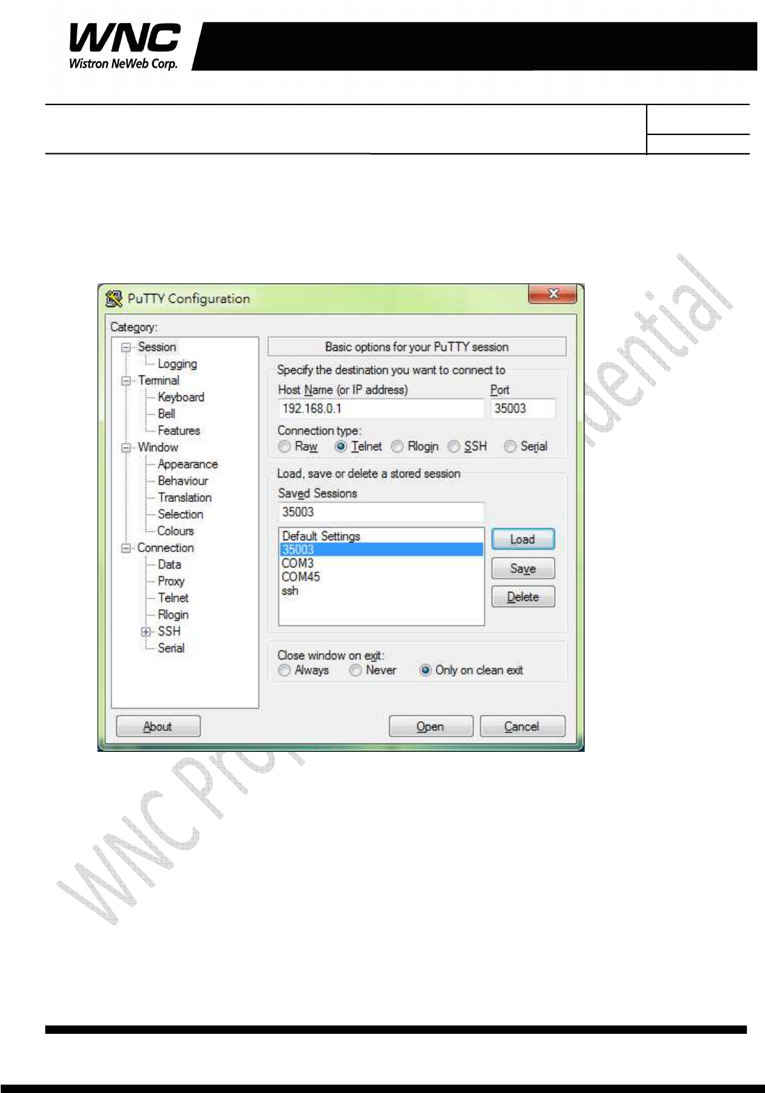 Telnet IP:192.168.0.1 Port: 35003