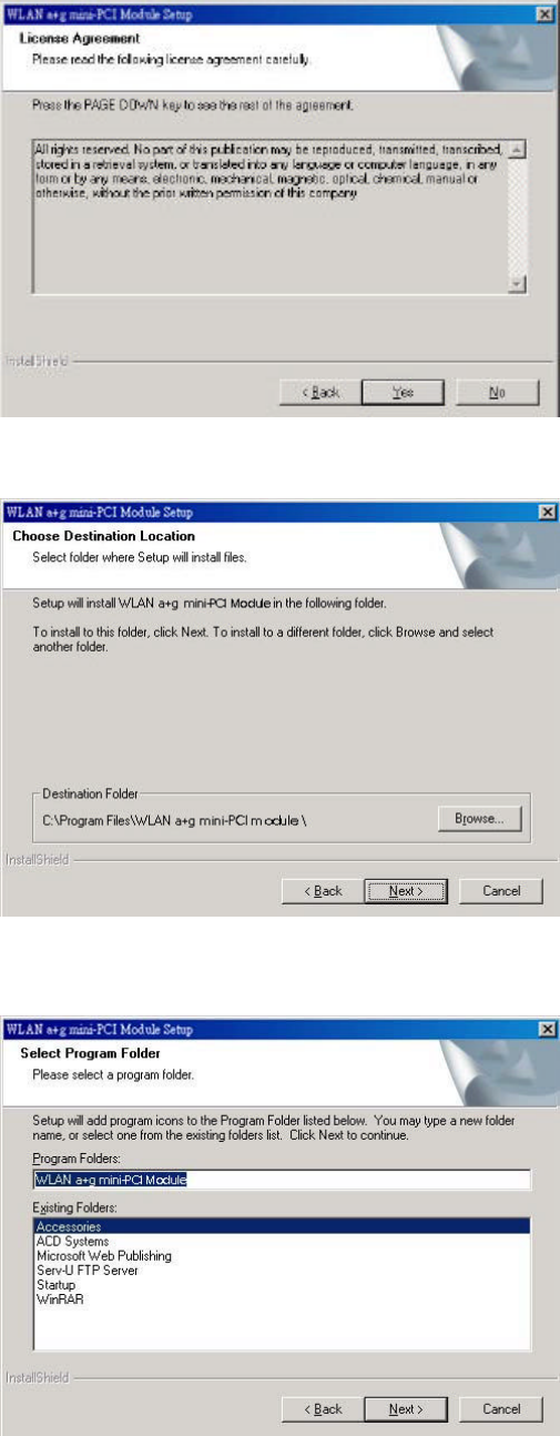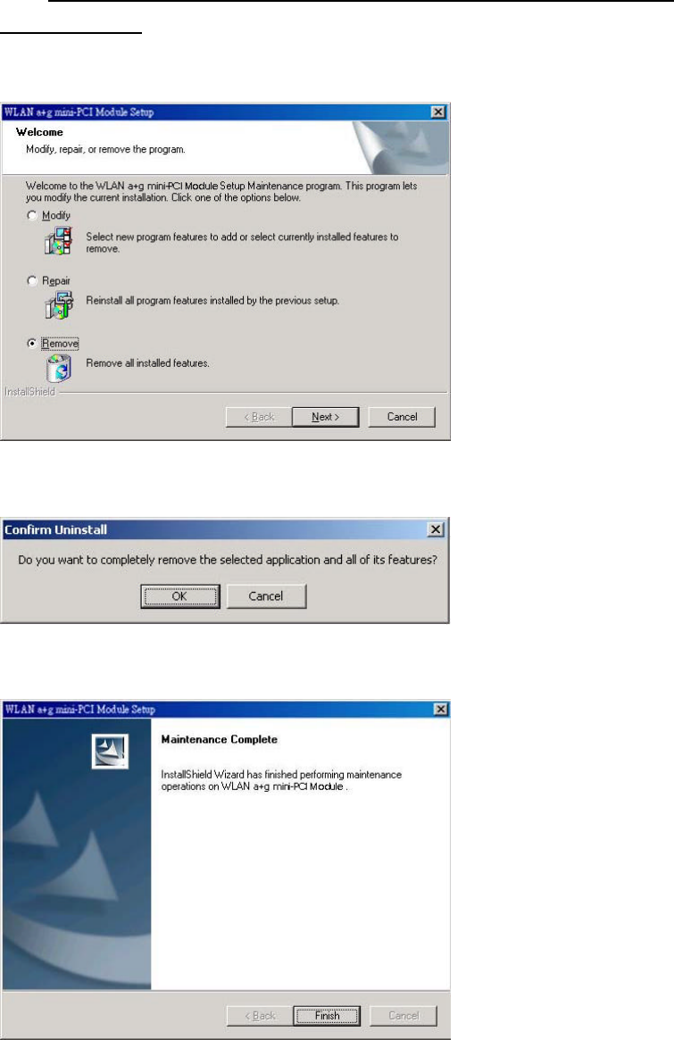 1. Click Start>Programs>WLAN a+b+g mini-PCI Module>UnInstall WLAN a+b+g
