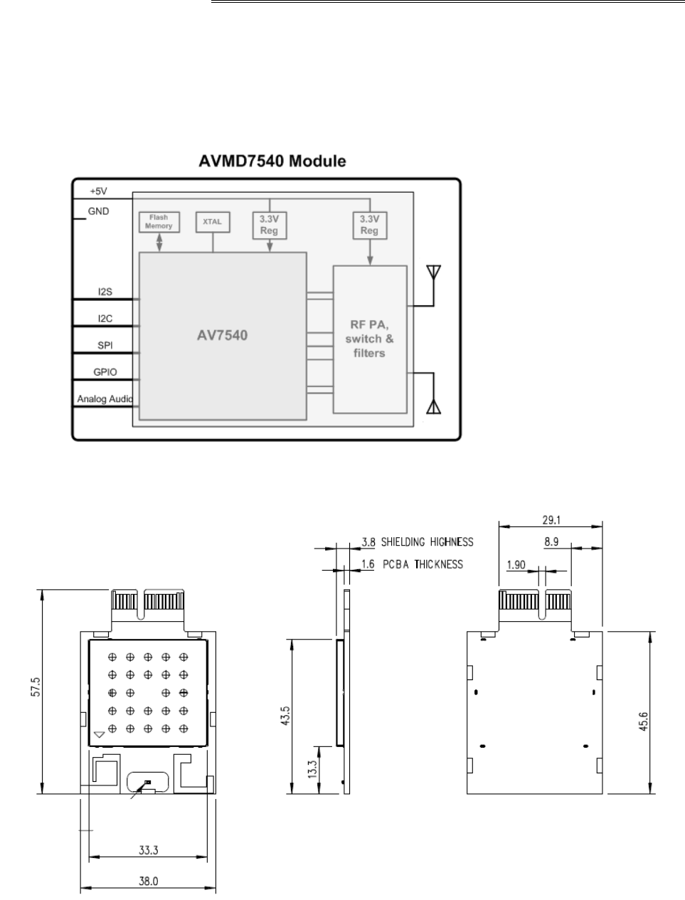 The module is comprised of a AV7540 IC combined with RF front-end circuits (RF PA + balun + filter
