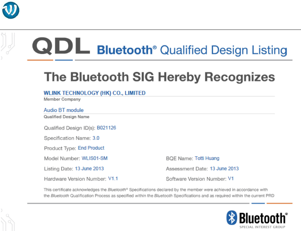 Taiwan Wlink Electronic Technology Co., Ltd Audio BT module Users Manual