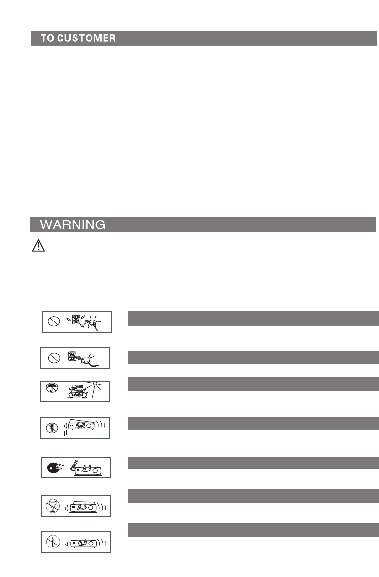 Keep the unit away from water drop or splash. Do not put liquid or liquid vessel