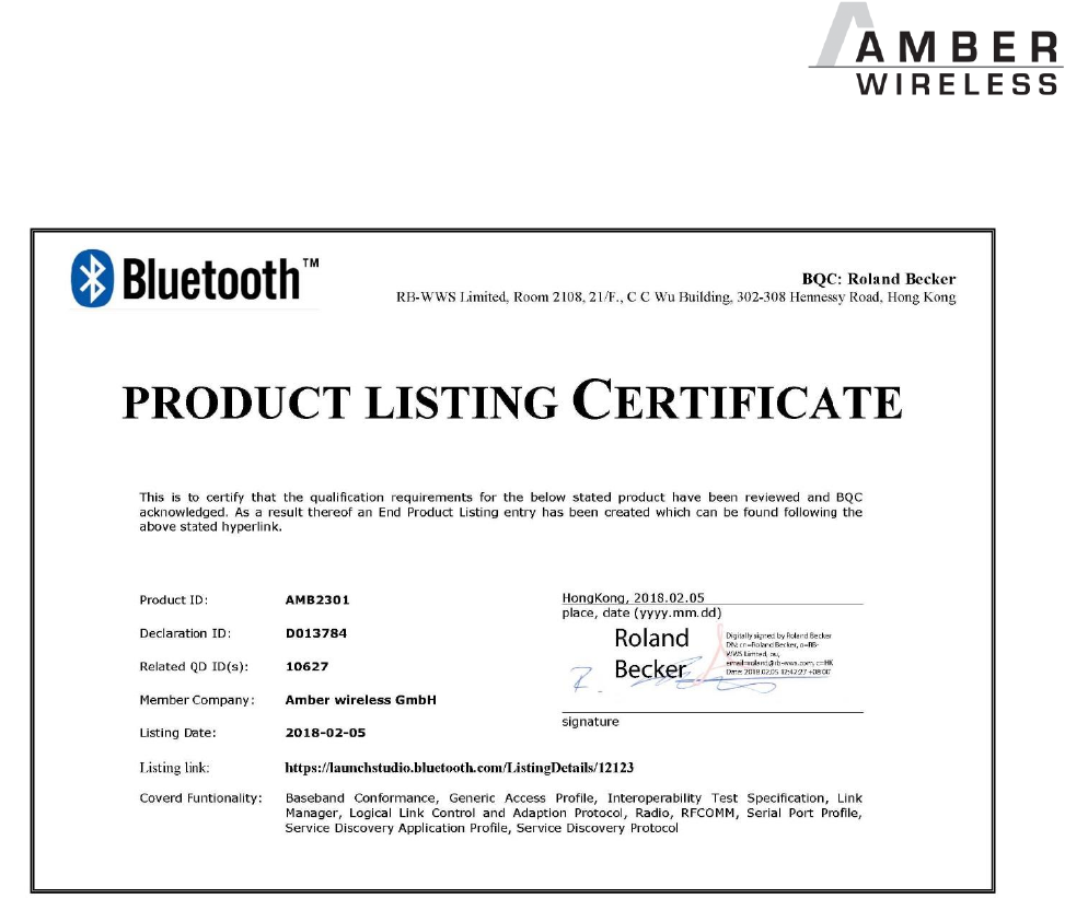 No modification concerning the Bluetooth listing is required, as the AMB2301 comes under the same Declaration