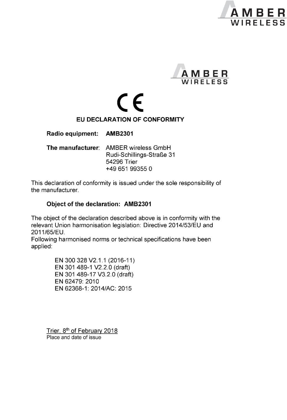 The conformity assessment of the subassembly AMB2301 carried out by AMBER wireless GmbH does not replace