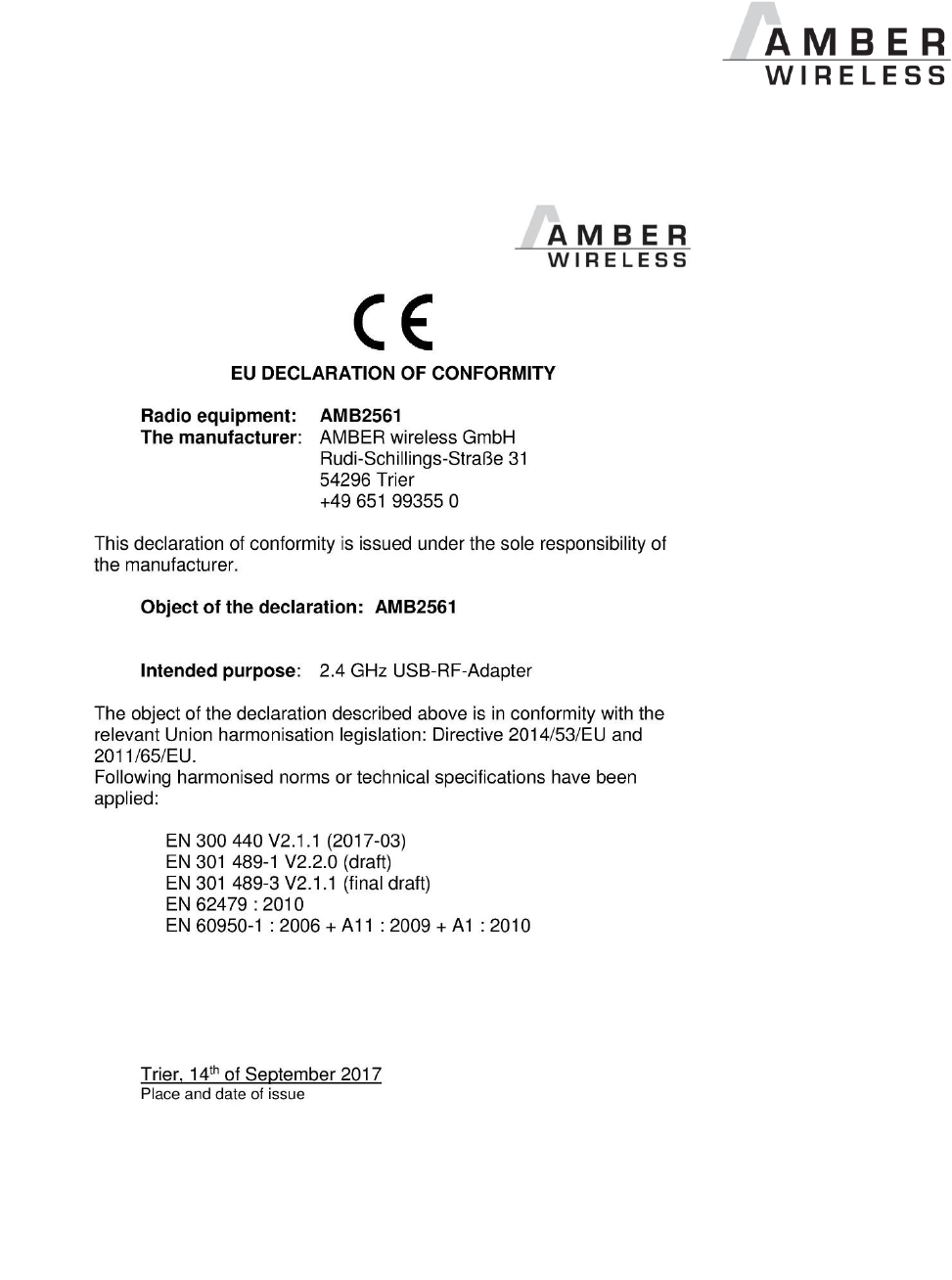 The conformity assessment of the subassembly AMB2561 carried out by AMBER wireless