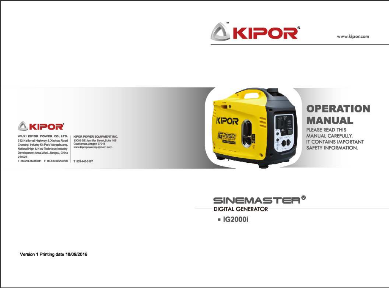 Wuxi Kipor Power 21402801 KPRO-A-RC User Manual PAI IG2000i 20161021