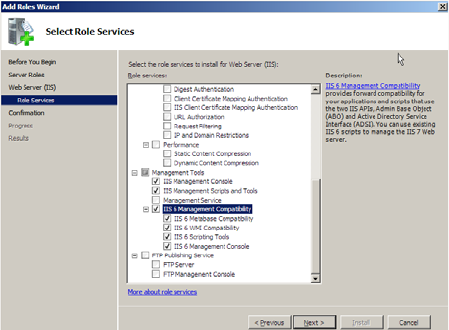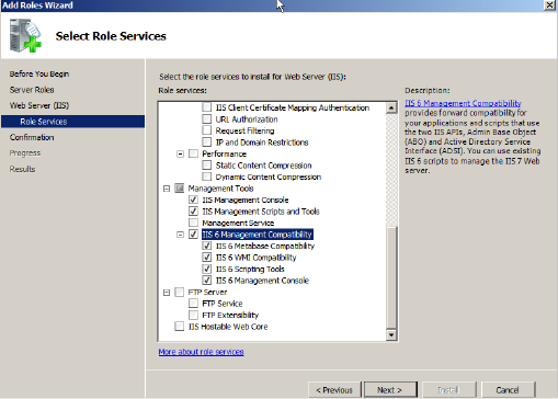 10.Under Role Services, expand IIS 6 Management Compatibility, be sure that all