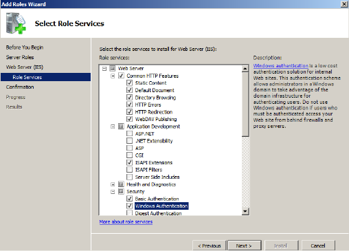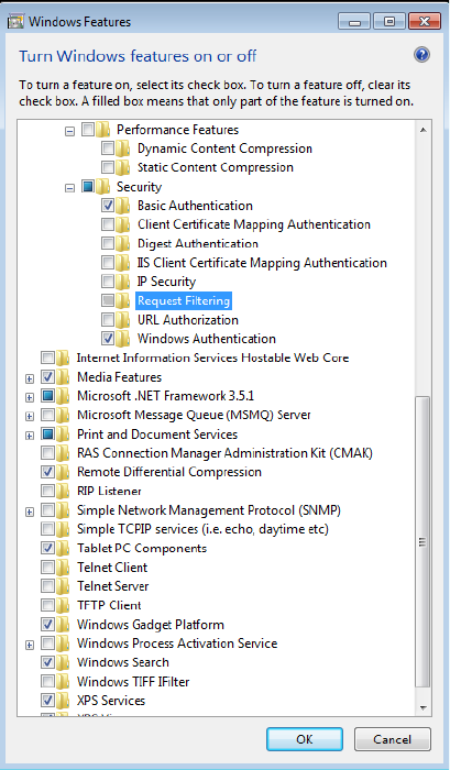 Windows Authentication check boxes, and then be sure that Request Filtering