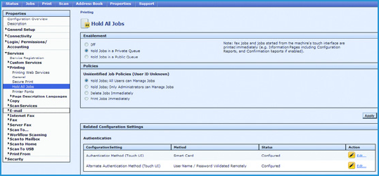 Xerox offers a feature called Hold All Jobs. This feature ensures all jobs are held securely at the MFD and are only