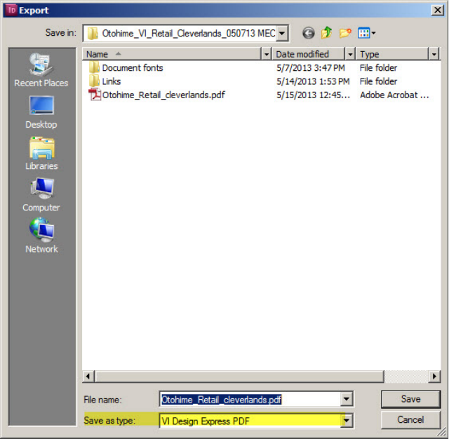 set the Save as type: to VI Design Express PDF as shown in the highlighted area. Use the pull-down list to