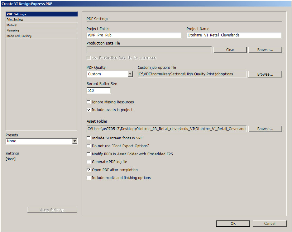 The Create VI Design Express PDF screen displays and the PDF Settings panel opens.