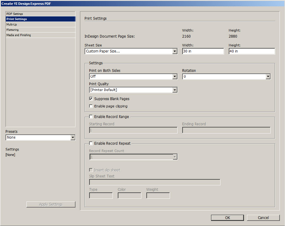 10. Leave all other settings on this panel as shown above. Because this not a multi-up (imposed) document and no