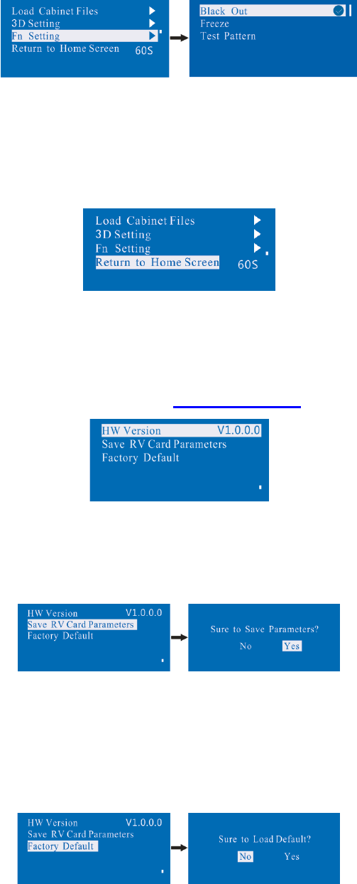 The functions of custom button include Black Out, Freeze and Test Pattren. Press Fn key to directly conduct