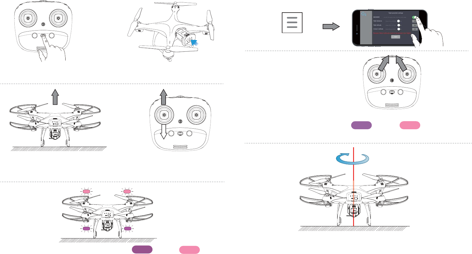 ⑤ LED indicators on the drone will blink Purple (Back) and Pink (Front) when