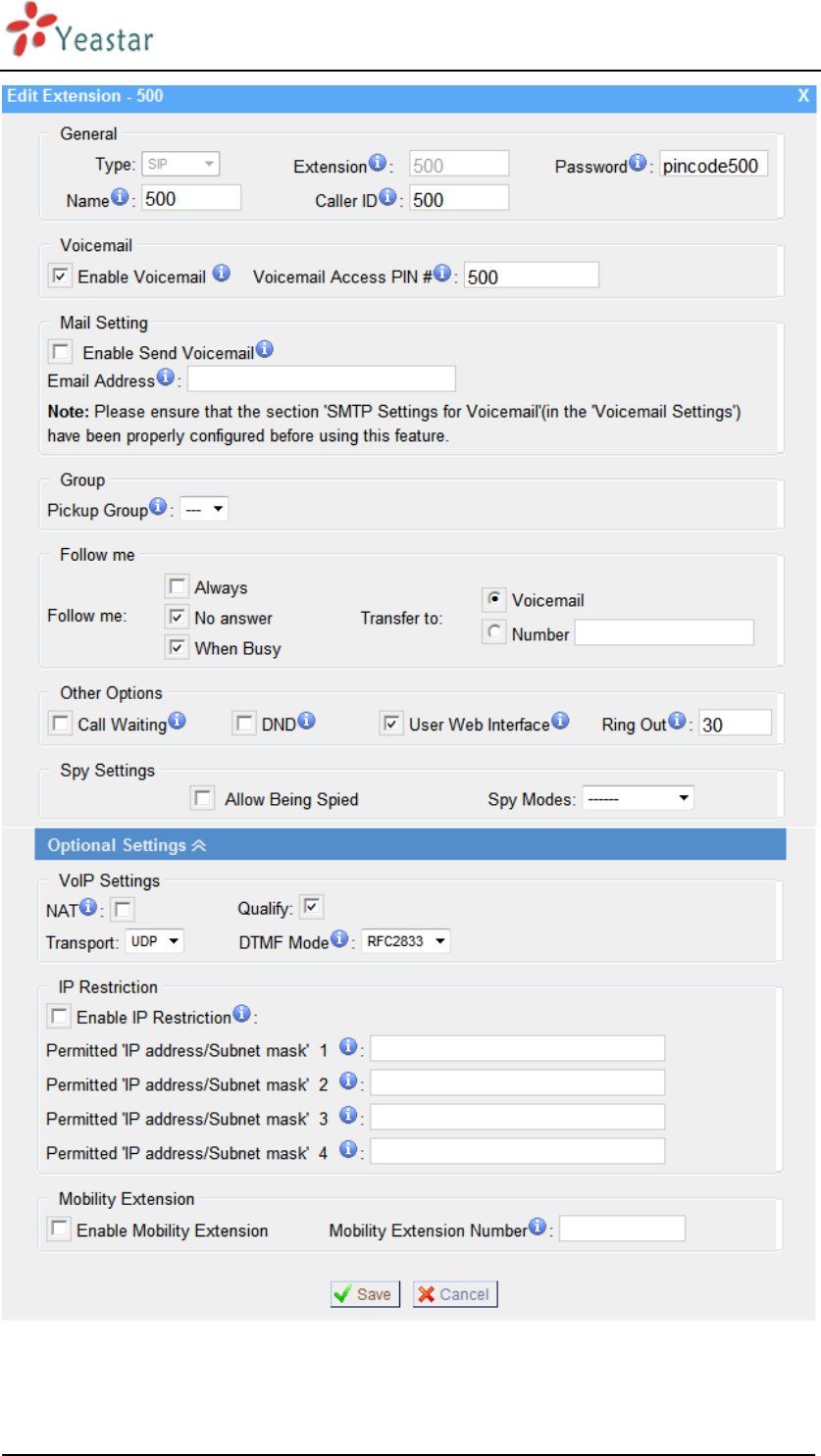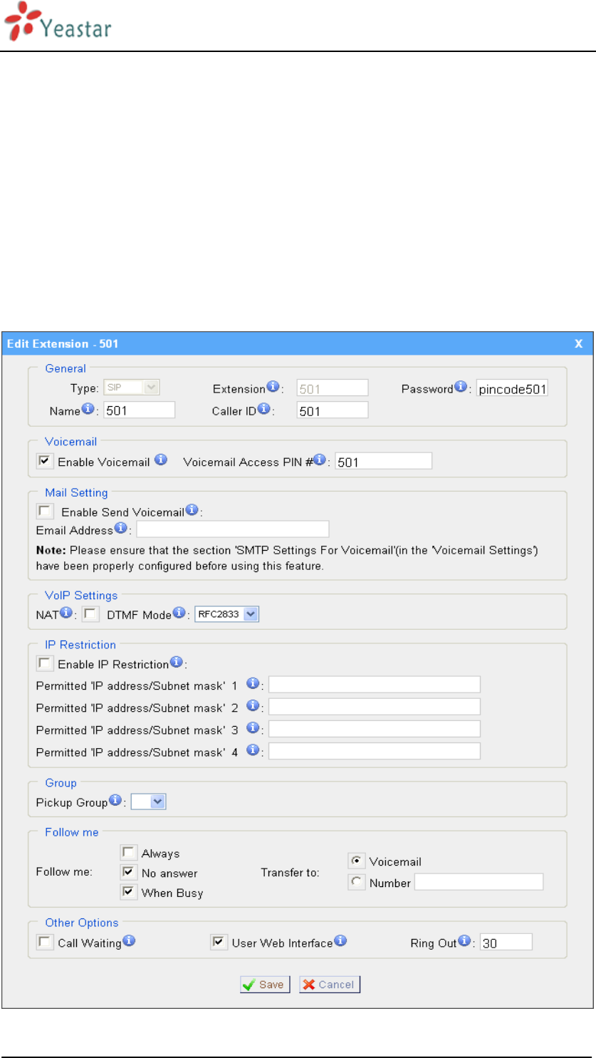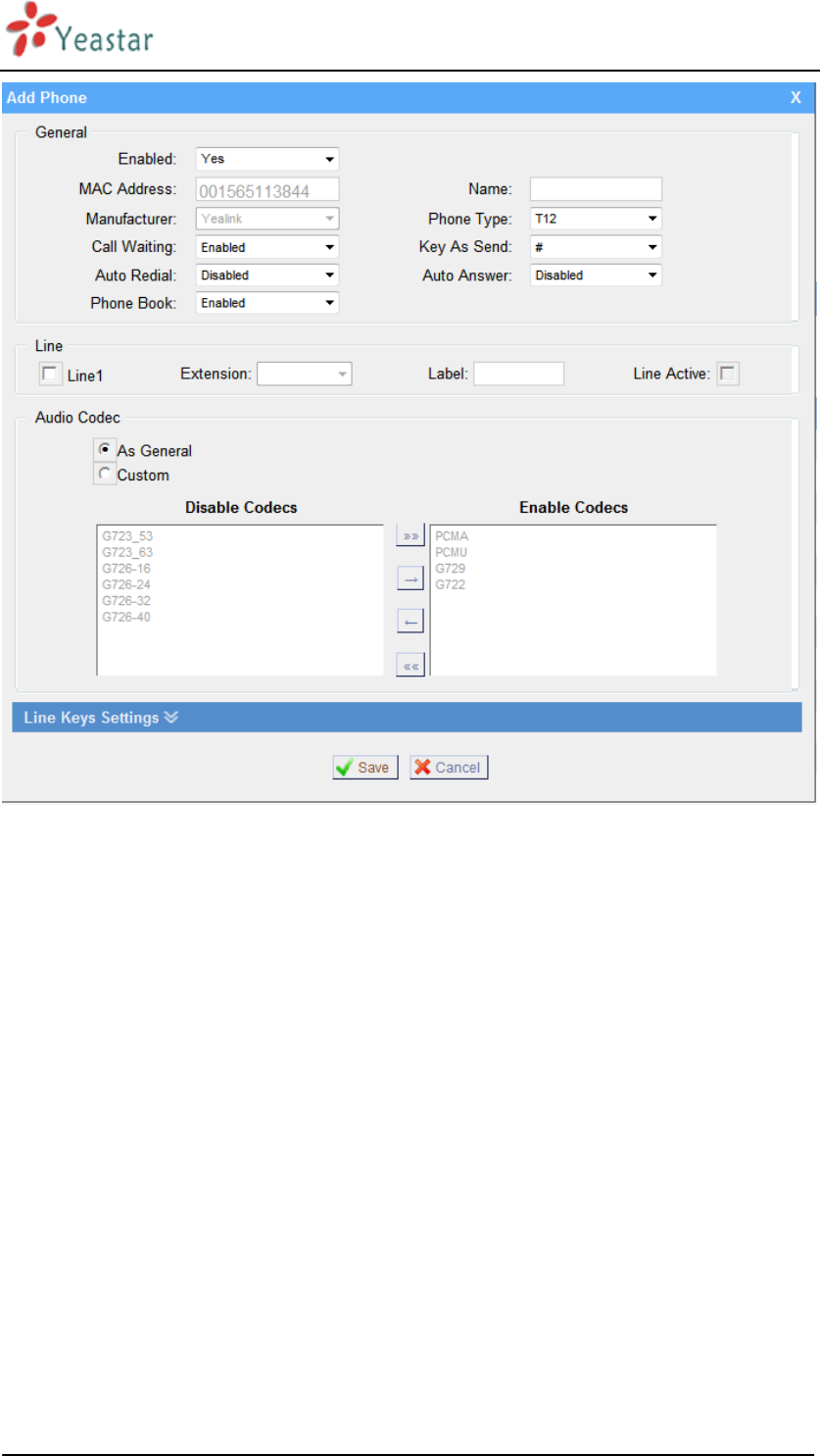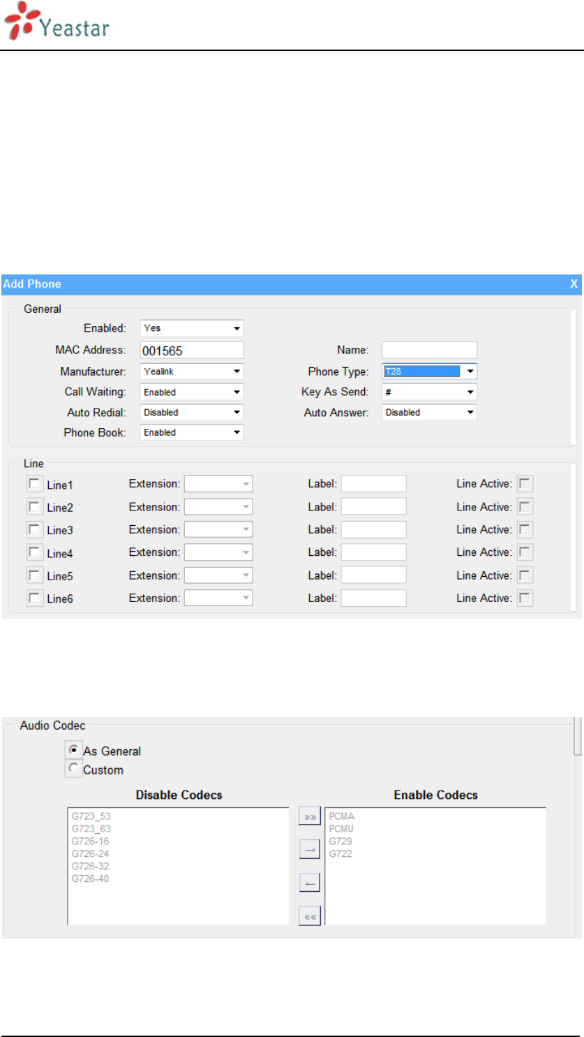 Input IP Phone’s MAC address, configure Name, Call waiting, Line, Extension,