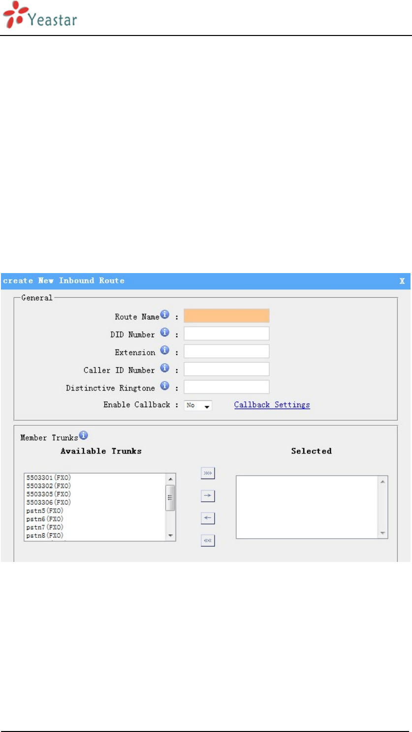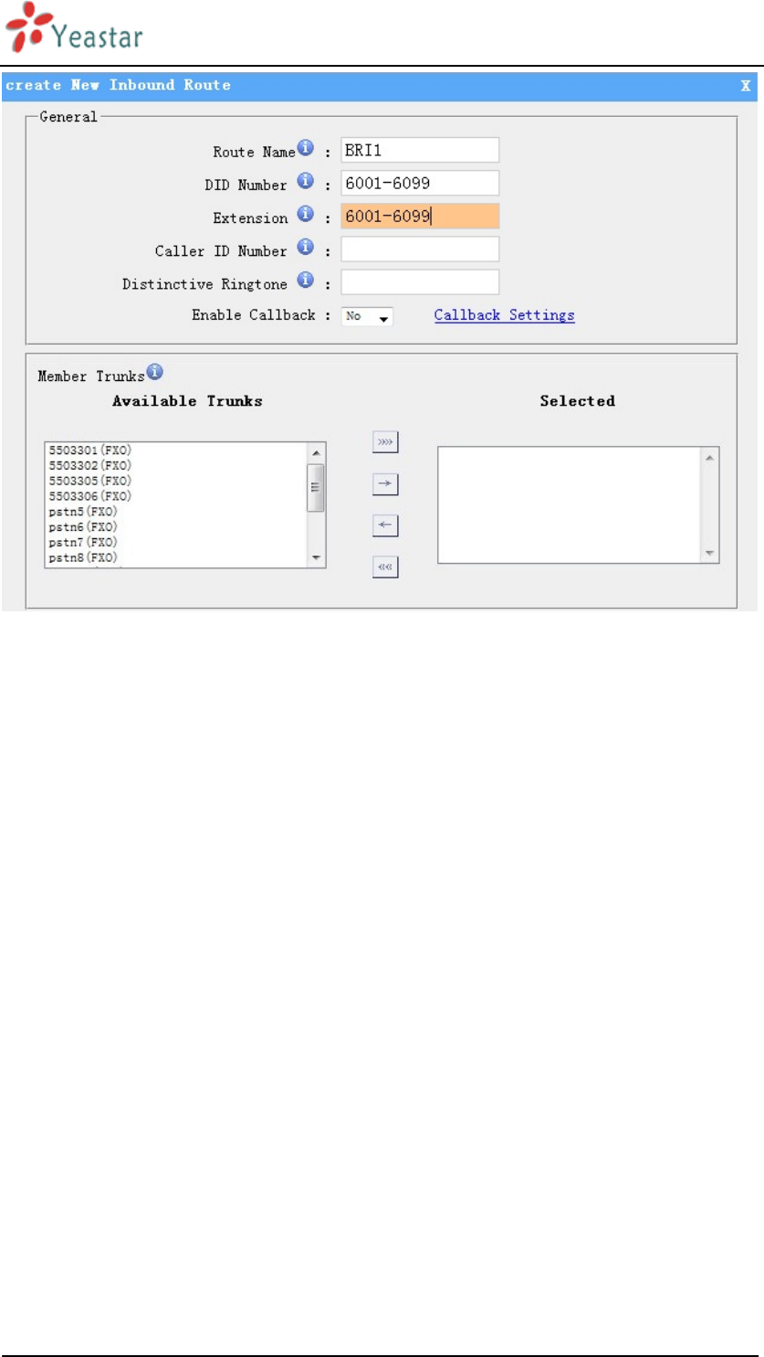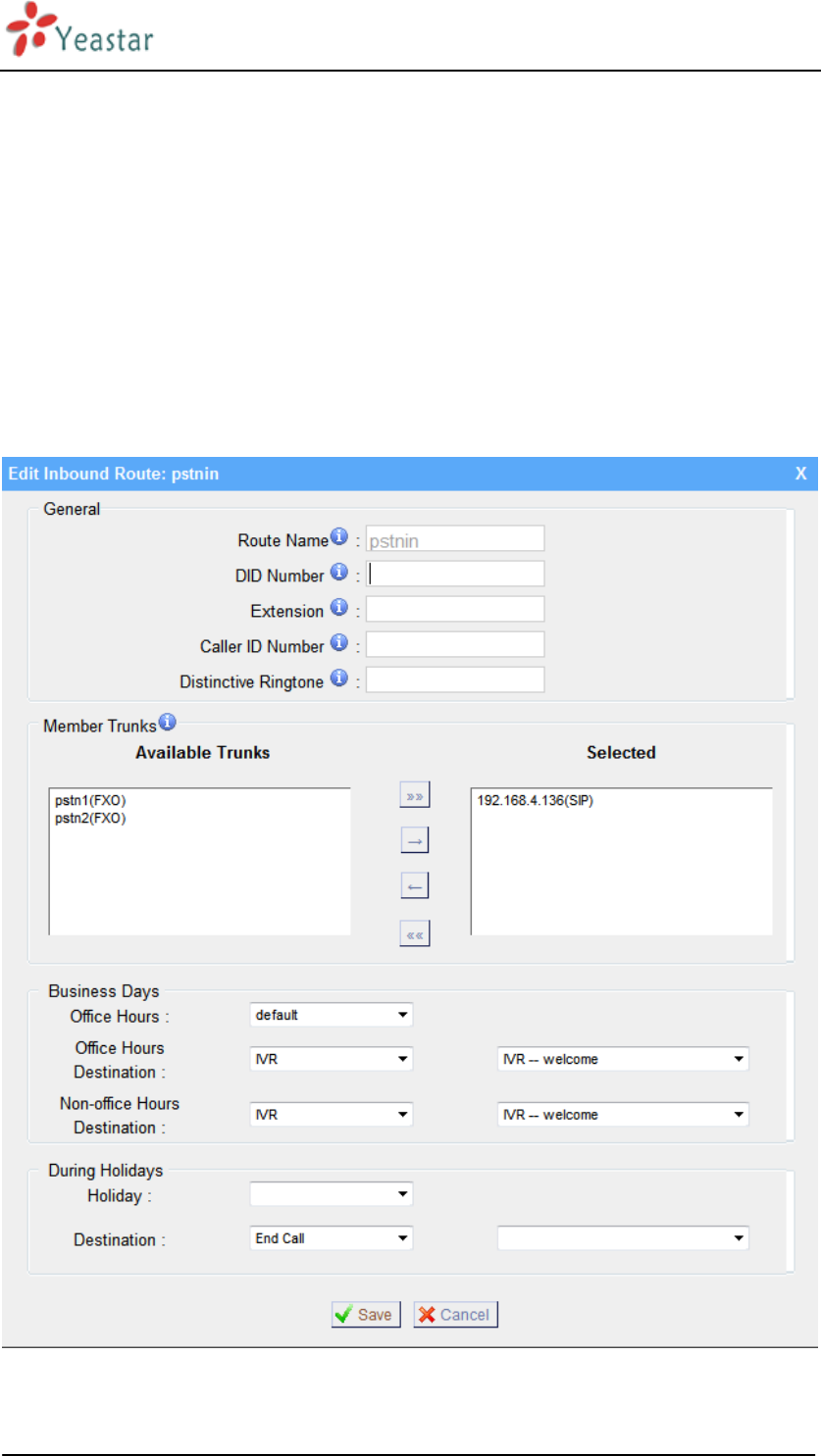 MyPBX web interface, Inbound Routes Æ Edit Inbound Route, fill in the Internal