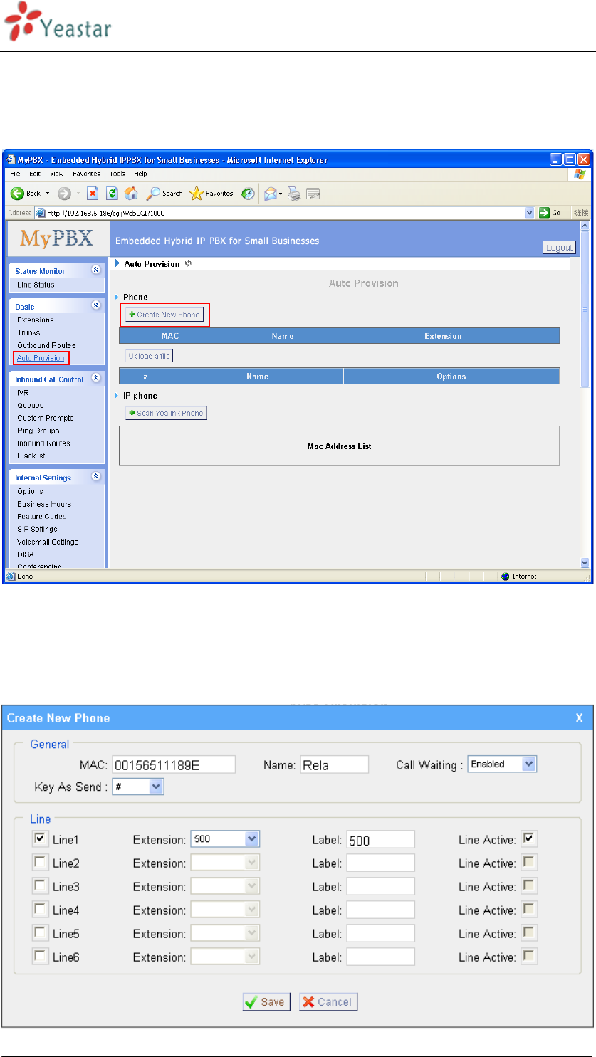 1. Login MyPBX web interface, Basic Æ Auto Provision Æ Create New Phone.