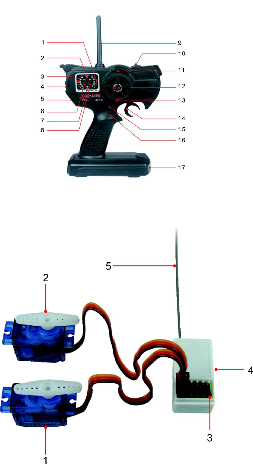 (Picture 2 is receiver. 1 is CH1 servo (direction) .2 is CH2 servo (throttle) 3 is Power Jack. 4 is