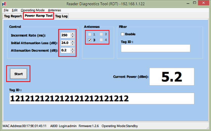 1. Select Power Ramp Tool tab after logging in Reader Diagnostics Tool (RDT).