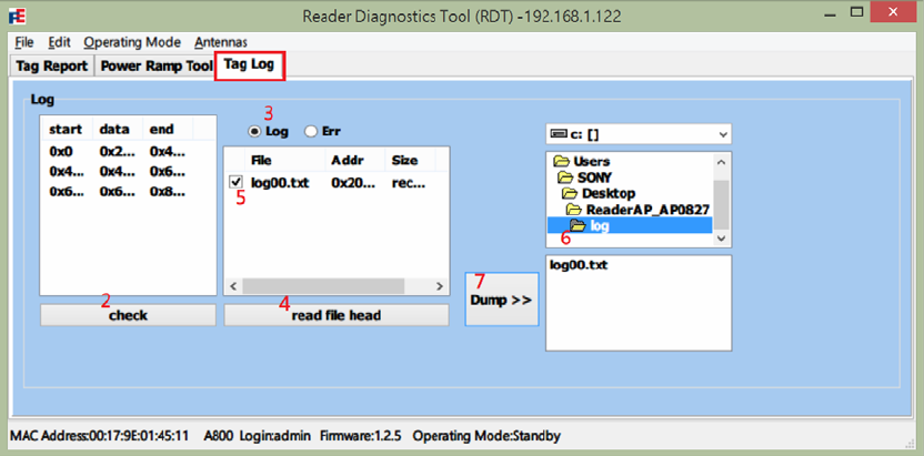 1. Select Tag Log tab after logging in Reader Diagnostics Tool (RDT).