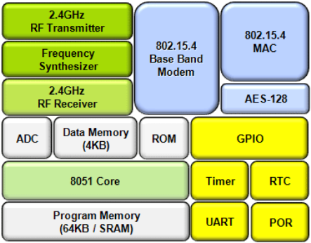 transceiver, RF circuit, 8051 compatible MCU and several components. It follows IEEE802.15.4 and