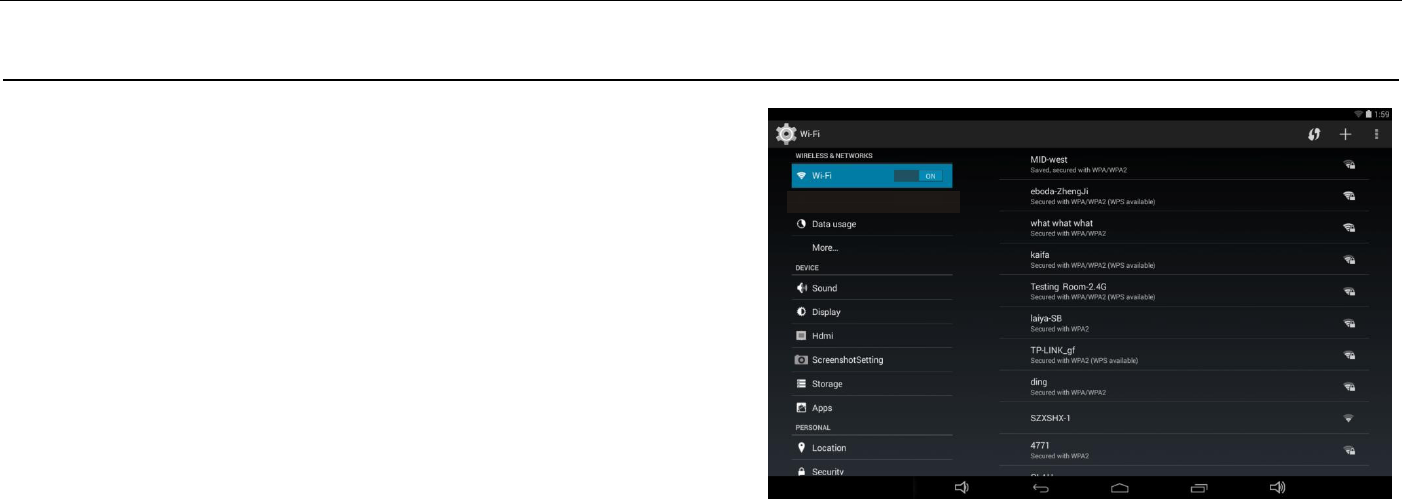 Wi-Fi: Click ON or OFF to open or close Wi-Fi. When open Wi-Fi,