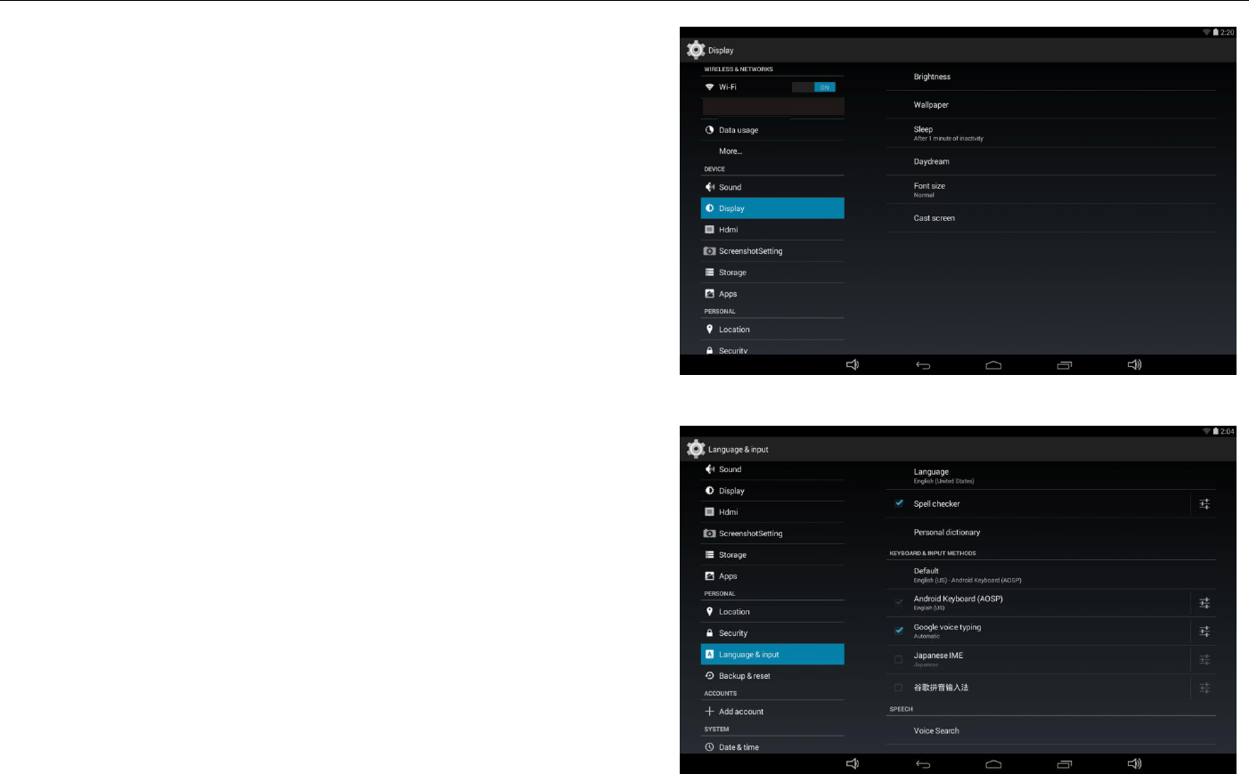 Brightness, Wallpaper, Sleep, Font size and so on.