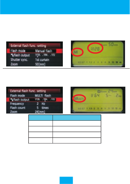 Flash mode: E-TTL(II), Manual flash, Multi flash